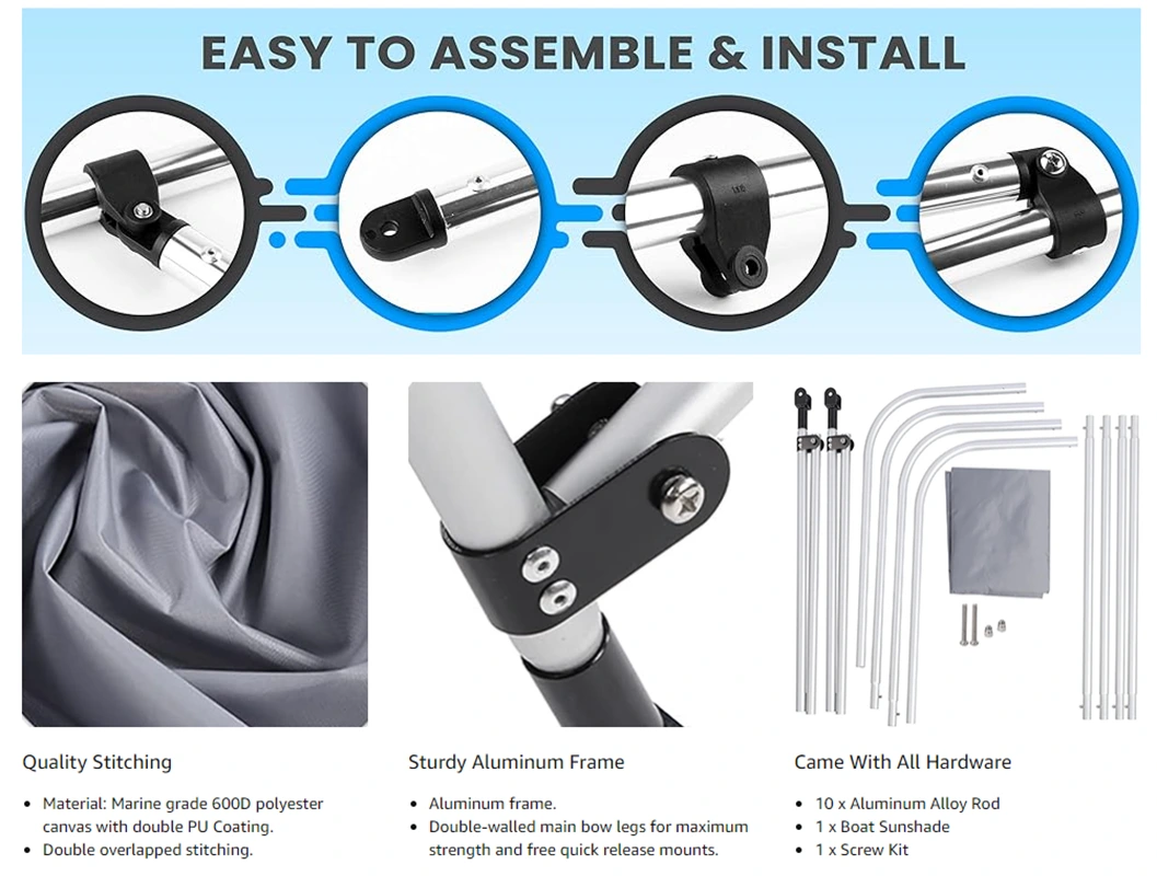 Tulë e zgjatur e varkës prej alumini. E përshtatshme për gomone me fryrje, kanoe, kajak, varkë peshkimi. Hija jonë e varkës ju mban nga dielli dhe shiu, ideale për varkat Runabout, V-Hull Boats, Jon Boat, Bass Boats, Boats inflatable, Fiberglass BoatsZhejiang Jiayu Outdoor Products Co., Ltd mund të përfundojë në vetëm disa minuta pa ndonjë të veçantë mjete në mënyrë që ta instaloni lehtësisht dhe shpejt.