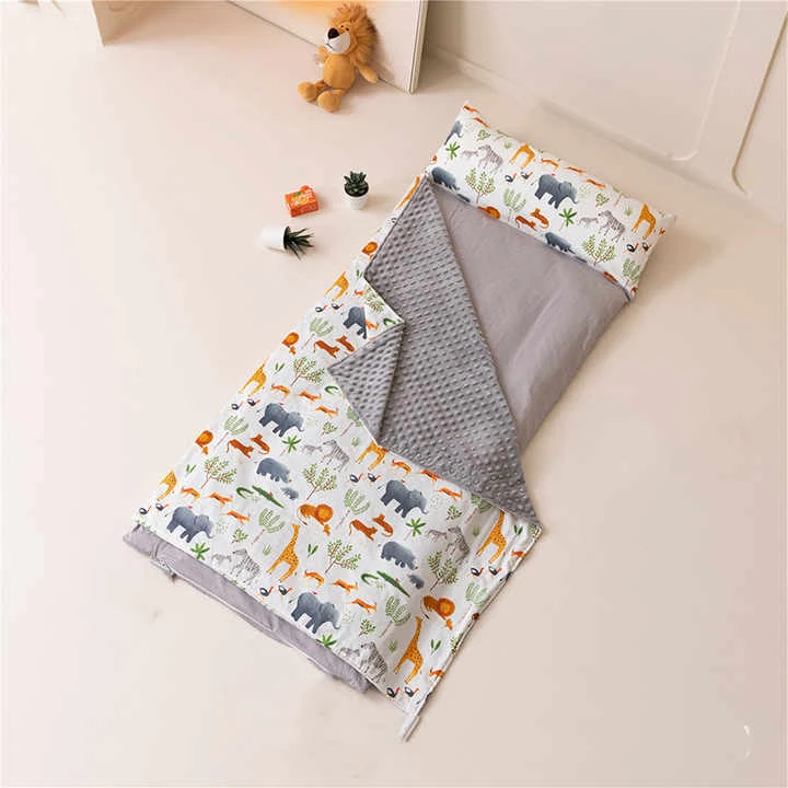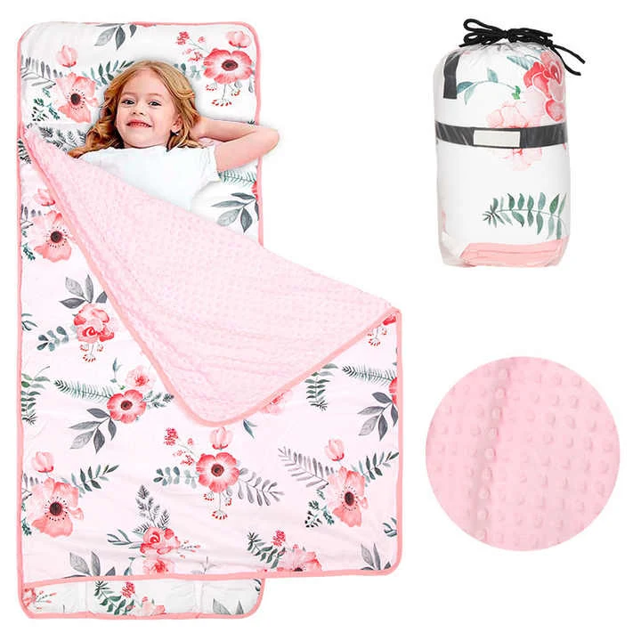 Baganta e gjumit të kampeve të vogëlushëve Blu Dizajni i Rollup lejon që dysheku të udhëtojë me lehtësi, si dhe shiritat e përshtatshëm të mbylljes së fiksimit dhe dorezën mbajtëse.