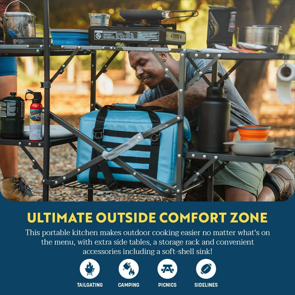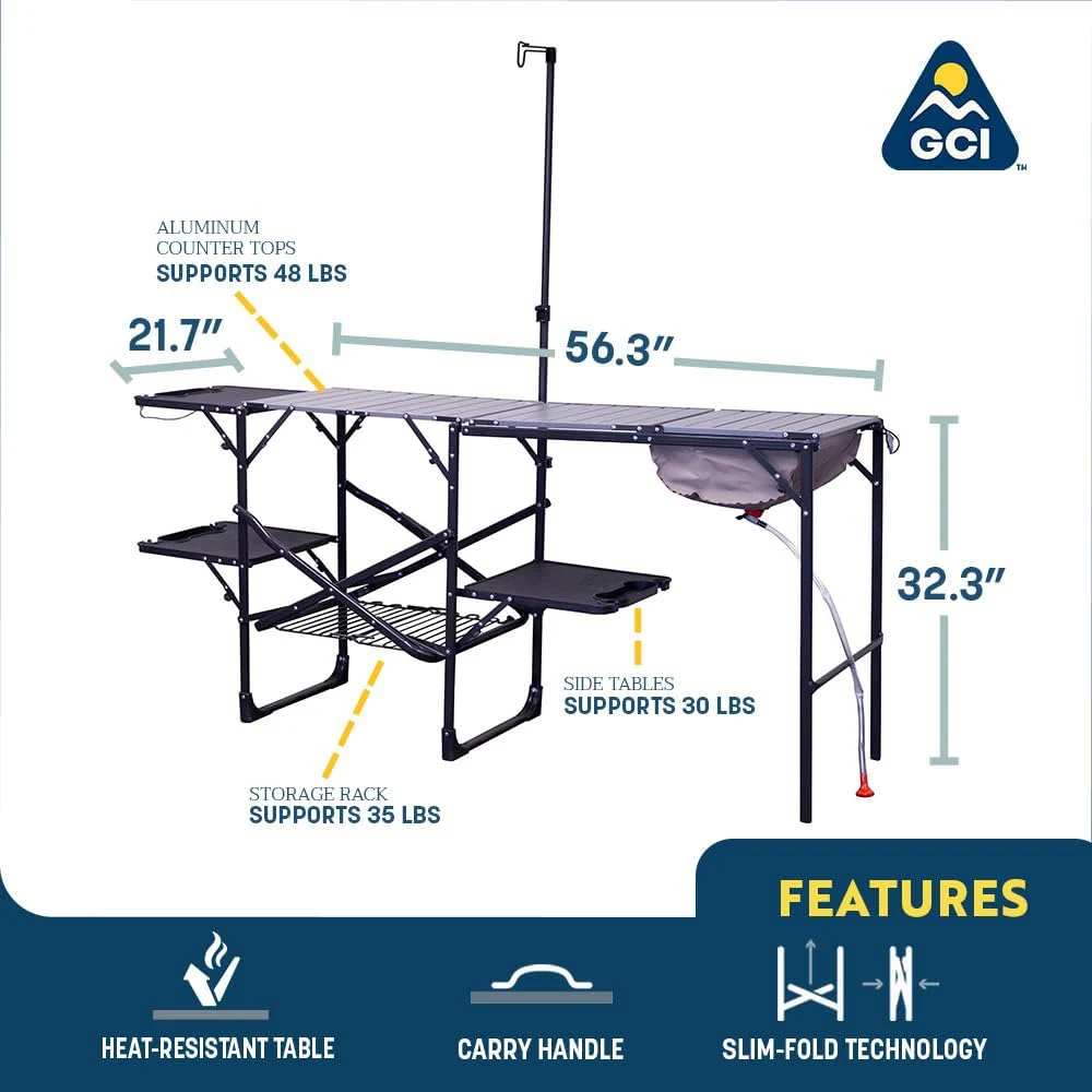 Tabela e kampingut të portabël të palosura të aluminit, bëni udhëtimet e kampit tuaj epik me stacionin Master Cook nga GCI Outdoor. Kjo kuzhinë e lëvizshme është e mbushur me karakteristika (duke përfshirë një lavaman me guaskë të butë!), Duke e bërë atë shtesë të përsosur për veshjet tuaja ose thelbësore të kampeve.