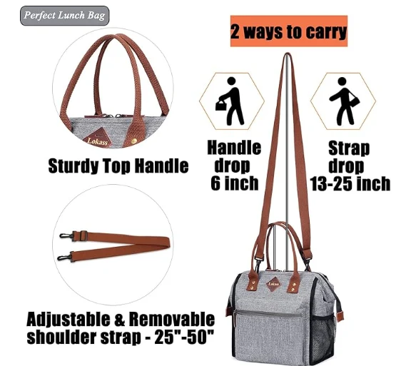 Baganta e madhe e drekës ka një ndarje kryesore (10.5 "x6" x12 "), një xhep të madh zinxhiri përpara (8" x7 "x1.5"), një xhep të pasmë (9.5 "x6.5") dhe 2 xhepa të rrjetës anësore. Dorezat kryesore dhe modeli i rregullueshëm dhe i heqshëm i shpatullave (25 "-50") dizajn për bartje të lehtë.