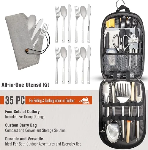 Baganta për ruajtjen e gatimit në kampe në natyrë Kjo grup i veglave të gatimit të kampeve 35 kompjuterë është një zgjidhje e plotë për nevojat tuaja të gatimit në natyrë. Ai përfshin një grup kuzhine kampingu dhe grupe gatimi të veglave të kampeve, të gjitha të mbushura mjeshtërisht në një çantë me porosi me ndarje shtesë dhe dy xhepa të pasme. Seti është krijuar për të kujdesur për të gjitha gjërat thelbësore të gatimit tuaj në kampe, duke e bërë atë një shtesë të domosdoshme për veshjet tuaja të kampeve