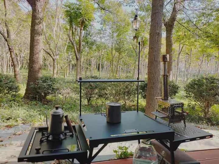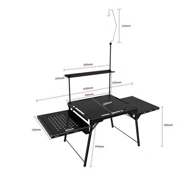 Tabela e kampingut të portabël të palosshëm të aluminit, platforma e tryezës së ngrënies përbëhet nga pjesët e sipërme, të mesme dhe të poshtme, me hapësirë të mjaftueshme për ruajtjen e të gjitha llojeve të tavolinave, ushqimit dhe kondicionerëve.
